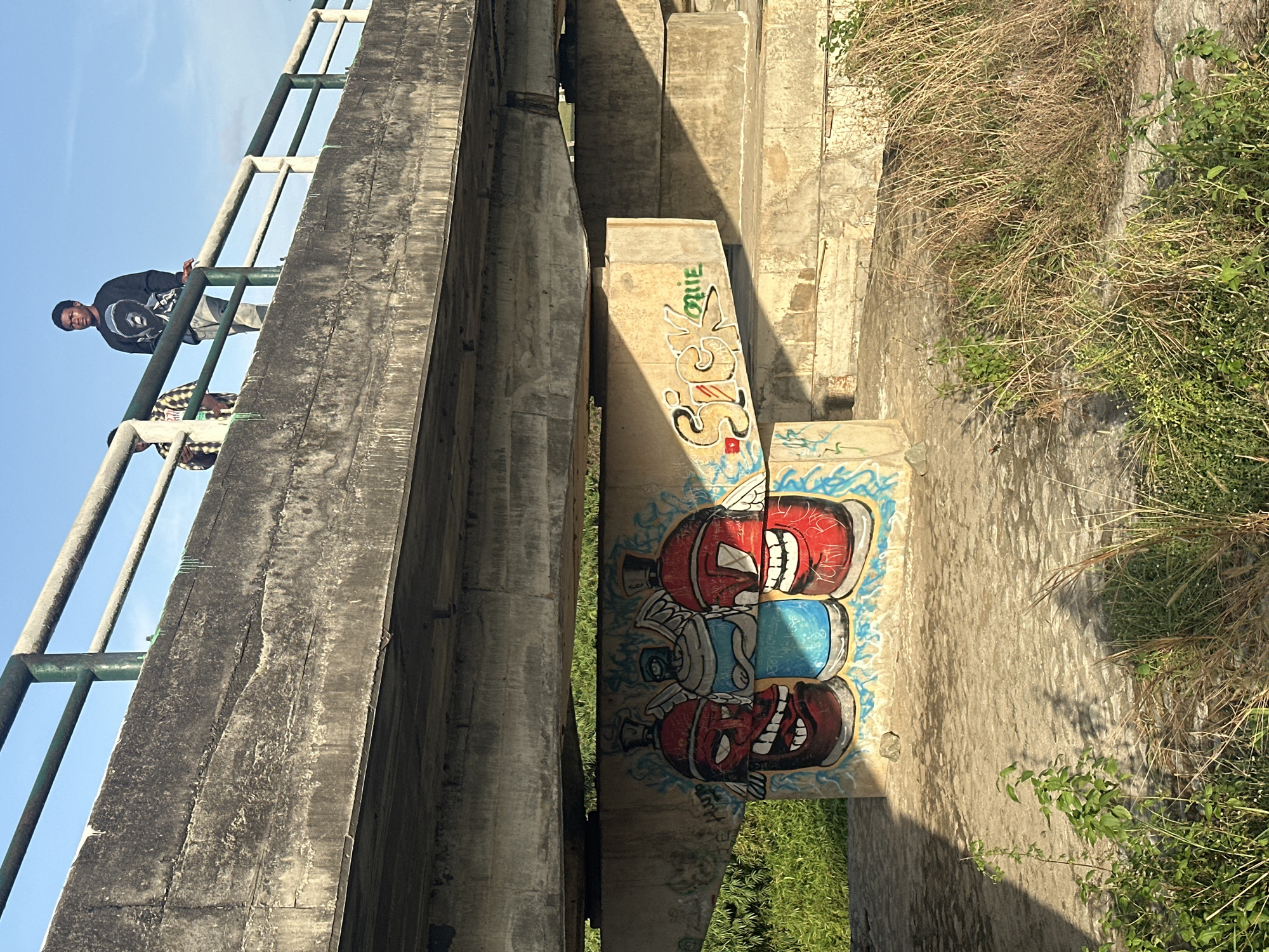 The photograph depicts a concrete bridge structure in Ihiagwa, Nigeria. Two individuals are visible standing on the bridge, partially obscured by the railings. Graffiti art covers a concrete support pillar beneath the bridge. The environment includes dry grass and green vegetation growing near the base of the structure.