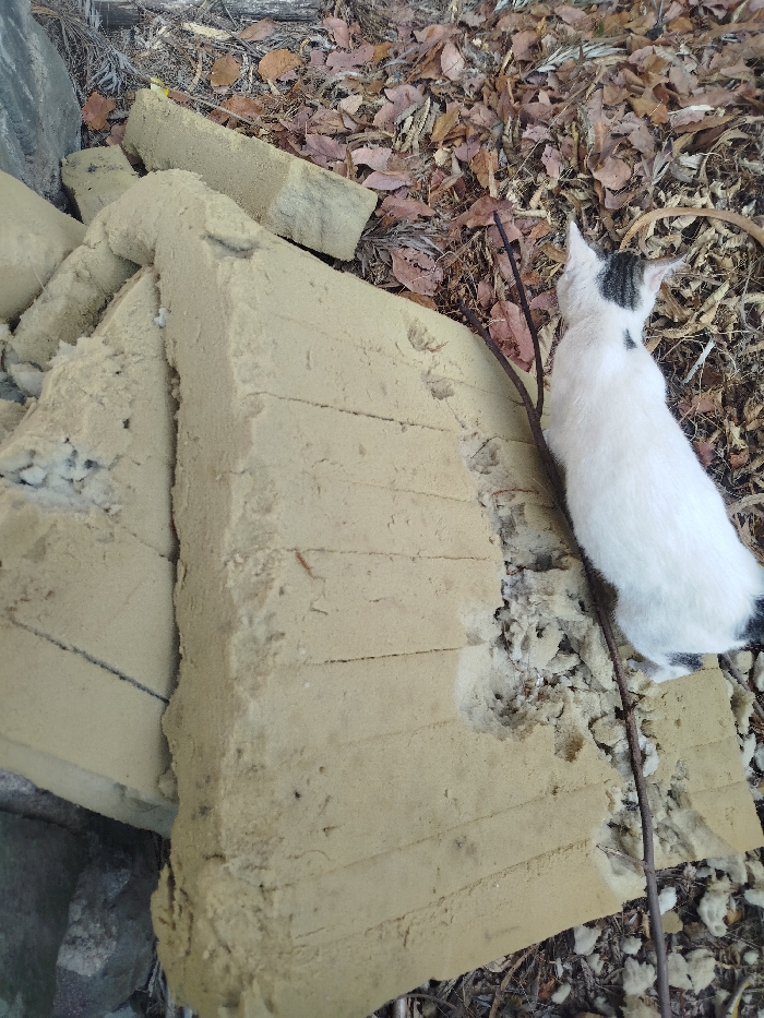 A white cat with black spots sits near beige foam wreckage among fallen leaves and debris. The foam is stacked and appears worn, with visible tears and internal stuffing. A thin branch lies near the cat and foam. The scene has a somewhat disheveled and abandoned feel.