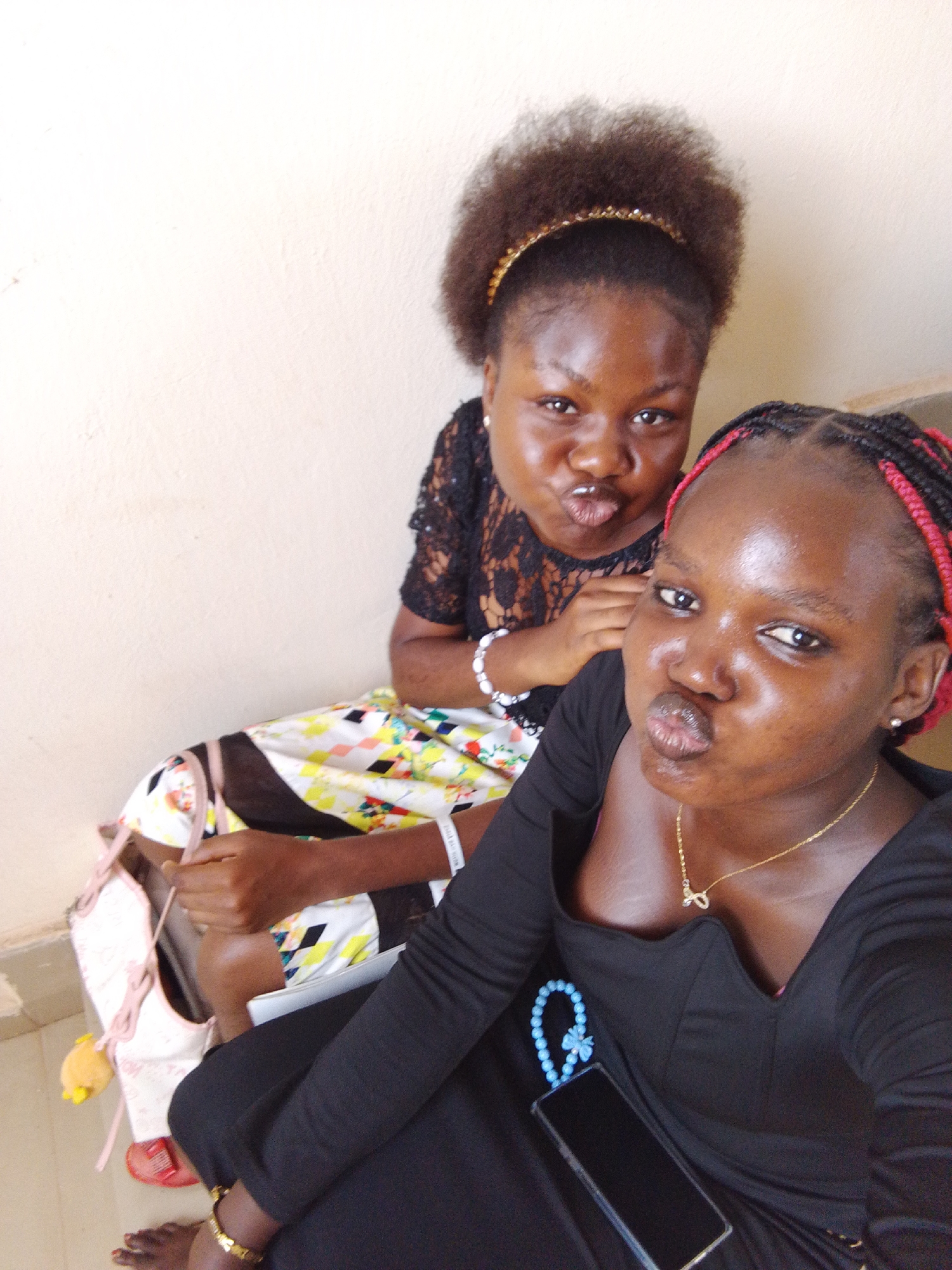Two dark-complexioned females are depicted in a close-up, selfie-style image, taken indoors against a plain light-colored wall and tiled floor, consistent with a location in Nsukka, Nigeria. Both subjects are seated and looking directly towards the camera with pursed lips. The foreground individual wears braided hair with red extensions, a black long-sleeved top with a low neckline, a gold chain necklace with a small pendant, and a gold bracelet on her left wrist. A blue beaded rosary-like object with a blue butterfly pendant rests on a black smartphone positioned on her lap. Her bare right foot is visible on the tiled floor. The background individual exhibits voluminous natural curly hair secured by a gold-colored headband. She wears a black lace-sleeved top, a white beaded bracelet on her left wrist, and a multi-colored geometric patterned skirt. Her left hand is observed holding a light-colored strap. Partially visible near her feet on the floor are light-colored footwear with pink straps and a small yellow charm, alongside red footwear.