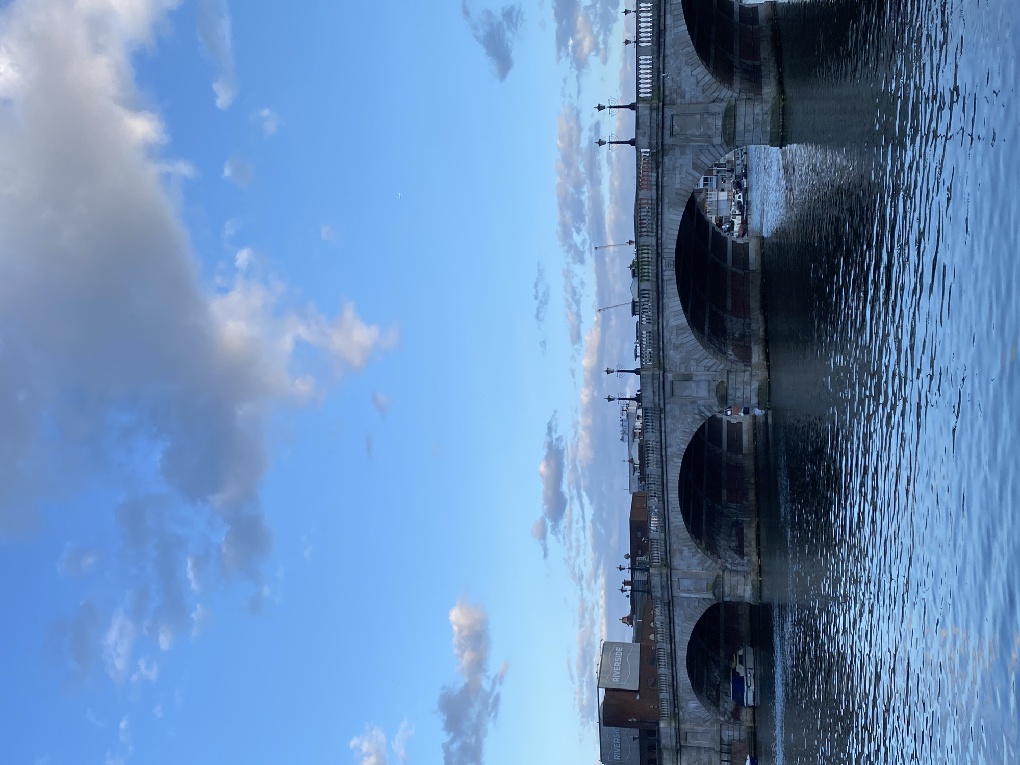 The image depicts a view of London Bridge spanning a river in London, United Kingdom. The bridge is made of stone, featuring multiple arches supported by pillars. Decorative street lamps are positioned along the bridge's railing. Below the bridge, the river reflects the structure and the sky. The sky is blue with scattered white and grey clouds. The angle of the photo has been rotated 90 degrees.