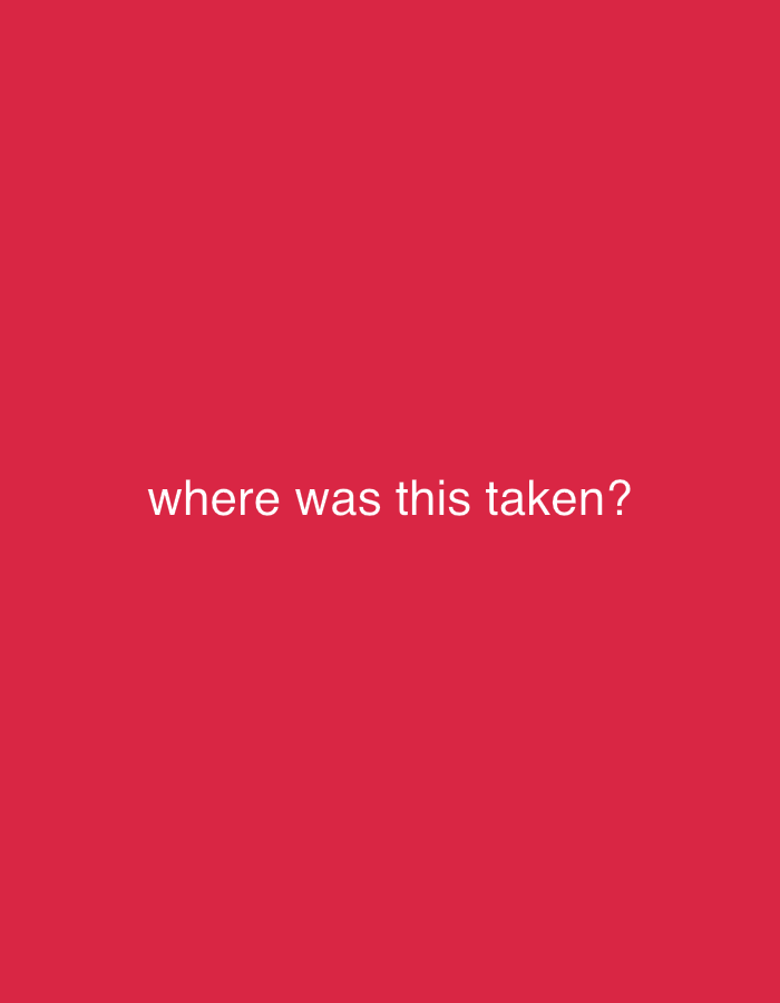 The image features a plain, bright red background. Centered on the canvas are the words "where was this taken?" in a simple, sans-serif white font. The stark contrast between the text and the background makes the question highly visible. The overall composition is minimalist and relies heavily on color and text to convey its message.