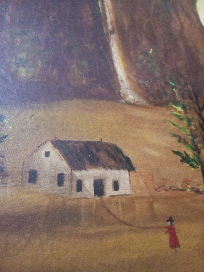 The image is a painting depicting a rural landscape scene in Zee Pin Kone, Myanmar. A prominent white, single-story house with a dark, gabled roof stands in the middle ground, slightly left of center. The house features two dark rectangular window openings and a central dark door on its visible facade. A small, dark element protrudes from the roof's peak. It is elevated on a darker, likely earthen or stone, foundation. In the background, a thin white waterfall cascades down a steep, dark brown cliff or mountain, flanked by muted green and brown vegetation. The foreground and middle ground consist of broad, arid-looking terrain in shades of yellowish-brown. To the lower right, a small, stylized human figure is depicted wearing a long red robe and a dark, conical hat, facing towards the left. A thin, dark line extends from the figure's right hand, trailing across the yellowish-brown ground towards the left side of the frame. A sparse tree with green and reddish-brown foliage is visible on the right side of the frame, partially obscuring the background.