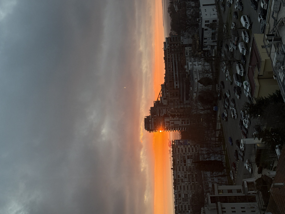 The image presents an elevated, wide-angle urban landscape of Burgas, Bulgaria, captured during either sunrise or sunset. The sky transitions from a dominant overcast grey in the upper two-thirds to a vivid orange and red band along the eastern horizon. The sun is visible as a bright, partially obscured disk within this orange band, positioned behind and intensely reflected by the multi-story, terraced modern building identified as Lazur Tower. A faint crescent moon is discernible in the upper-mid section of the grey sky. In the mid-ground, a large asphalt parking lot is densely occupied by numerous parked vehicles, including sedans, SUVs, and vans, facing various directions. To the immediate left of Lazur Tower, several uniform, older multi-story residential buildings with repetitive window patterns are visible. To the far left, a structure displays a faint, possibly illuminated sign with Cyrillic characters, appearing to spell "Arena." To the right of the parking lot, a collection of smaller buildings with varied architectural styles is present. Trees, mostly devoid of foliage, are sparsely distributed among the buildings and around the parking area. Beyond the urban structures on the horizon, the Black Sea is visible, partially obscured by atmospheric haze and the intense light of the sun. No human subjects or specific actions are discernible.