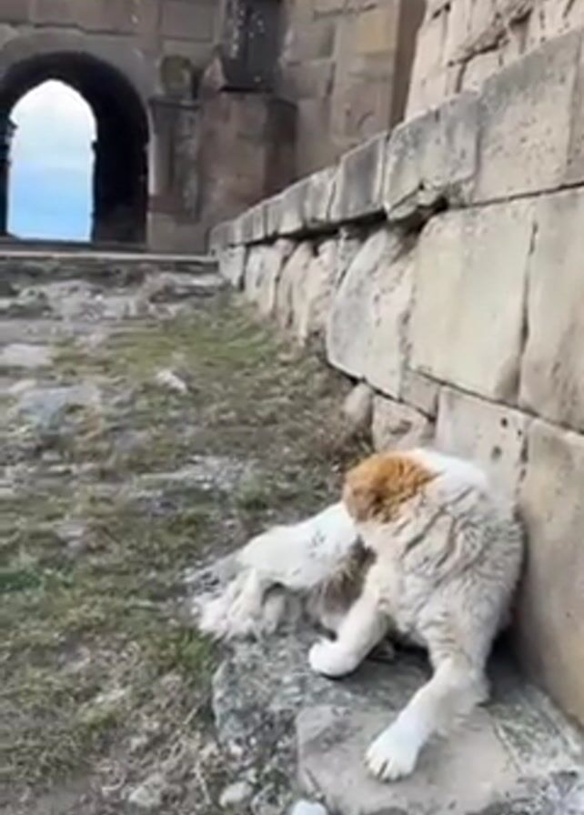 The camera pans up from a furry white and orange dog lying at the base of a stone wall, up to show a stone building and archway