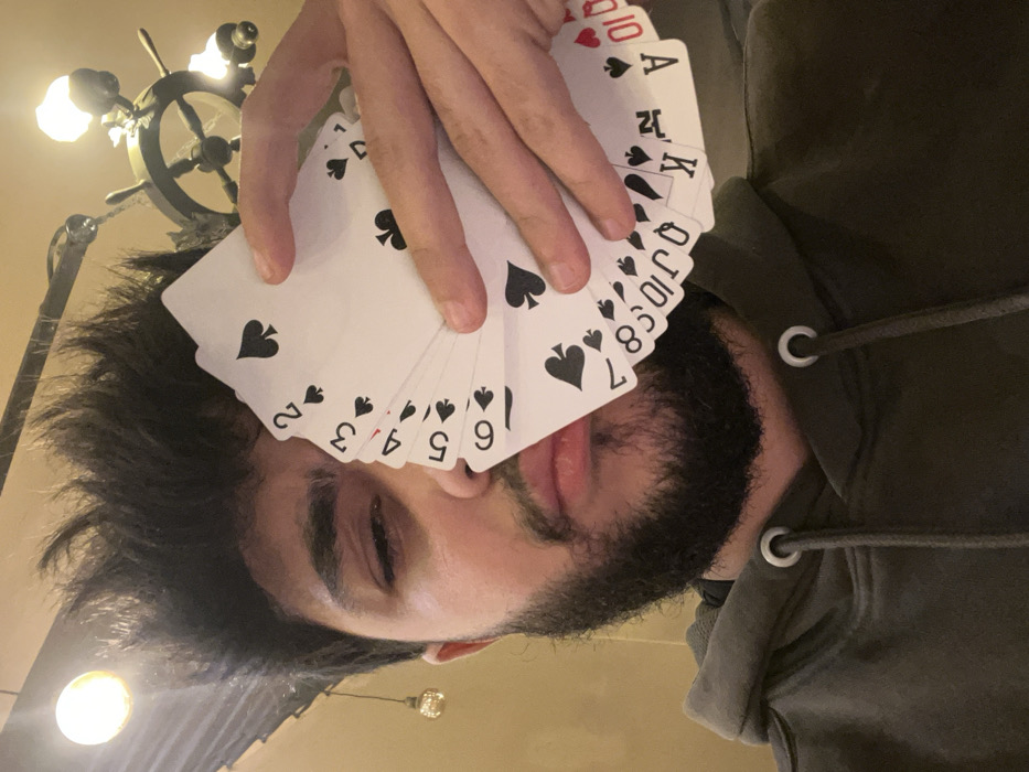 - "A person's face, tilted, features a beard, partially obscured by a hand holding a full set of playing cards" by FM-NiDCC3, licensed under CC BY 4.0