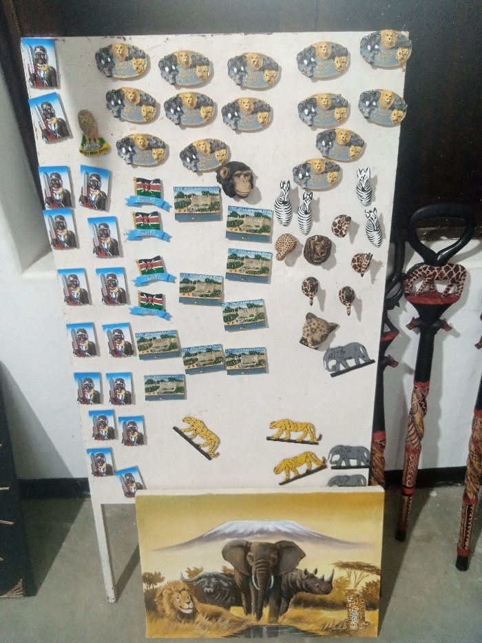 A white display board, oriented vertically, is densely covered with an assortment of souvenir magnets, standing against a light-colored wall. The magnets include 16 rectangular depictions of Maasai warriors, six "KENYA" ribbon-shaped magnets with national flags, and eight rectangular landscape magnets featuring a coastal fortress. Approximately 18-20 oval magnets display various lion faces, alongside one three-dimensional chimpanzee head magnet, four zebra-striped magnets, five flat leopard/cheetah figures, and three flat elephant figures. Smaller magnets with giraffe patterns and other animal details are also present. Leaning at the base of the board is a rectangular painting depicting an African savanna scene with an elephant, rhinoceros, lion, buffalo, and a distant snow-capped mountain under an orange sky. To the right of the board, several carved wooden walking sticks or staffs with animal-themed handles and patterned shafts are visible. The scene is set in Makadara/Mji Wa Kale ward, Kenya.
