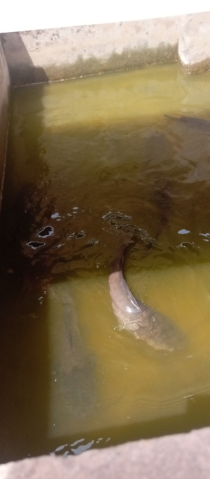 An elevated view captures a concrete aquaculture tank in the city of Rido, Nigeria. The tank contains a volume of opaque, yellowish-green water. A large, dark-colored fish, consistent with a catfish, is partially visible at the water's surface in the midground, its back and dorsal fin area breaking the surface and creating ripples. Indistinct shapes suggestive of other large fish are discernible deeper within the murky water. The upper sections of the concrete tank walls are visible along the top and left edges of the frame, exhibiting a weathered, light gray texture with areas of darker discoloration near the waterline. No human individuals or their belongings are present in the scene. The lighting indicates daylight conditions.
