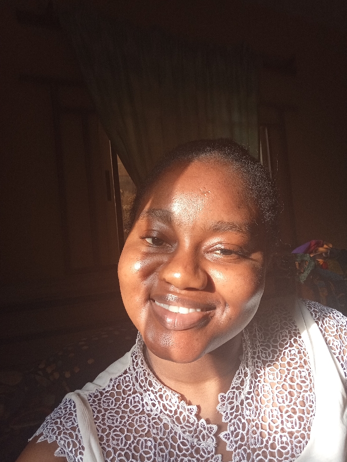 A woman smiles brightly at the camera. Her face is well-lit, showcasing smooth skin. She has dark hair pulled back from her face, and is wearing a white lace top. In the background, sunlight filters through a window with draped curtains. The room appears to be simply furnished.
