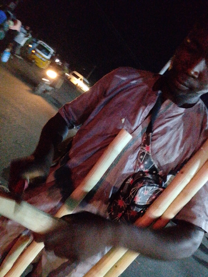 In low lighting, a man stands holding several light-colored wooden sticks. He wears a casual shirt and a patterned bag hangs across his chest. The background shows a street scene with blurred figures and vehicles, including a yellow tricycle and cars with headlights on. The overall impression is of a person immersed in an outdoor, possibly urban, environment.