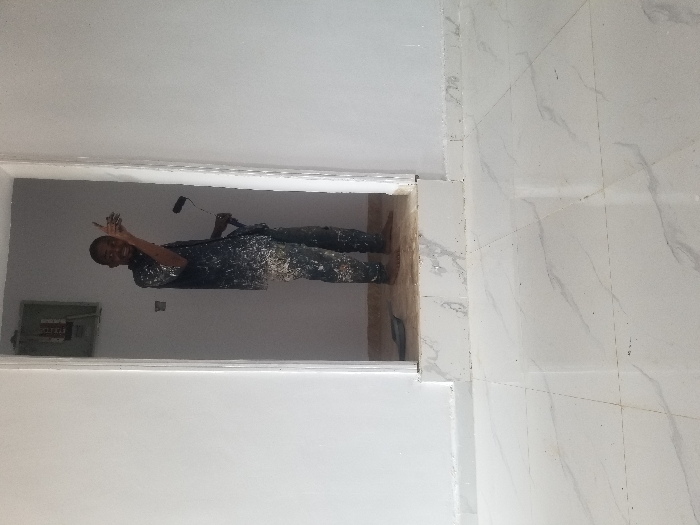 An indoor scene in Edu Town, Nigeria, displays a male individual standing barefoot within an open doorway. He wears a dark short-sleeved shirt and trousers, both heavily splattered with white paint. He holds a black-handled paint roller in his right hand, oriented downwards. His left arm is raised with the index finger extended upwards and to his left, and he is smiling towards the viewer. An electrical service panel is mounted on the white wall visible through the doorway, positioned to the man's upper left. A dark, shallow paint tray rests on the floor just inside the doorway, near his feet. The walls in the foreground and within the doorway are uniformly painted white. The foreground floor is covered with large, light-colored ceramic tiles featuring subtle grey veining, laid in a grid pattern. A matching tiled baseboard runs along the bottom of the foreground wall. The doorway itself has a slightly elevated, tiled threshold.