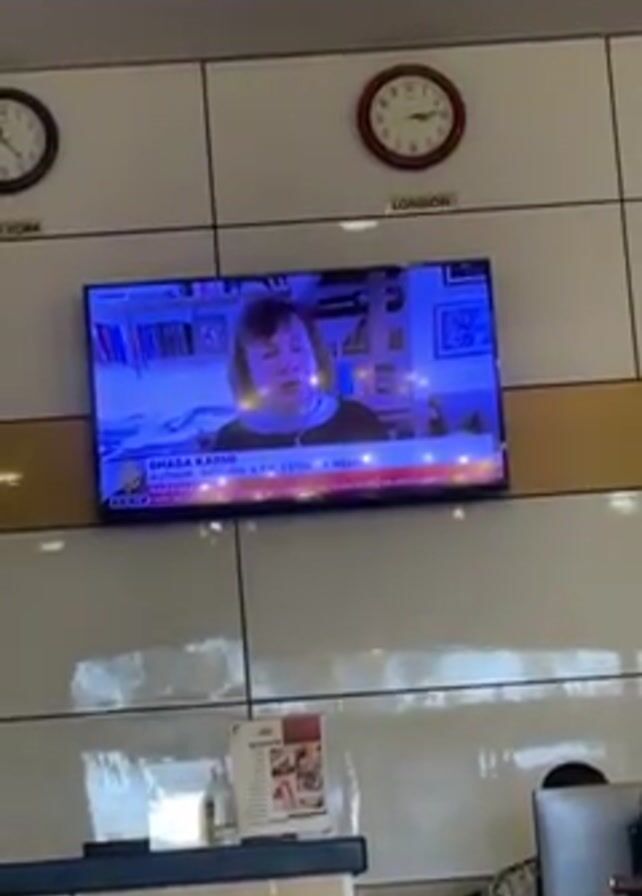 A television is mounted on a wall. The wall also has two clocks, one that says New York and one that says London. On the TV, there is an image of a woman, followed by an image of a man in a suit speaking, with smoke and burning buildings behind him. There is a reception desk in the foreground. There is a person sitting behind the reception desk.