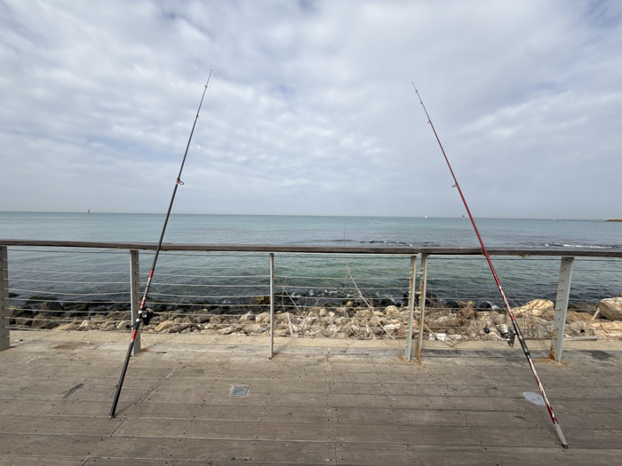 The image captures two fishing rods positioned on a wooden promenade overlooking the Mediterranean Sea in Tel Aviv, Israel