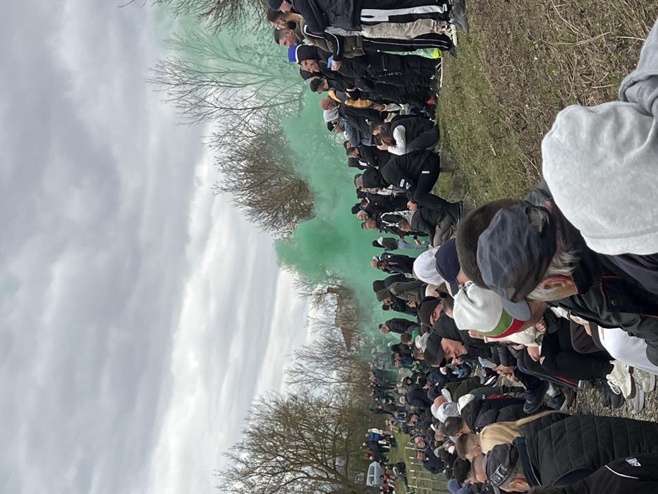 The image depicts an outdoor gathering of approximately 100-150 individuals, predominantly adult males, under an overcast sky in Koprivlen, Bulgaria. The crowd is distributed across a grassy earthen slope and a lower ground level. A dense cloud of vibrant green smoke emanates from the middle-right section of the gathering, rising above the heads of the attendees. Most individuals are dressed in dark, casual winter clothing, including jackets, hoodies, and hats, and appear to be observing an event in an unseen area to the left of the frame. Leafless deciduous trees line the horizon in the background, with a white vehicle and additional distant figures visible on the far left. The immediate foreground shows the backs and tops of heads of several spectators, including one wearing a beanie with white, green, and red stripes.