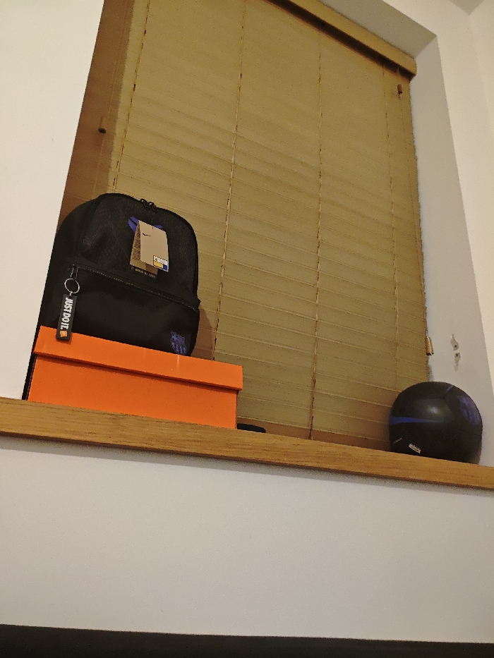 This image depicts an indoor scene within Swindon, United Kingdom. On a wooden window sill, a black Nike backpack, featuring a visible purple Nike swoosh logo and an attached product tag, rests on a bright orange shoebox. A black keychain with "JUST DO IT" in white text hangs from the backpack's zipper pull. To the right of the shoebox, a dark spherical object, identified as a football with a blue horizontal stripe and "FC BARCELONA" branding, is placed on the sill. The window behind these items is fully covered by closed light brown wooden slat blinds. The adjacent wall is painted white.