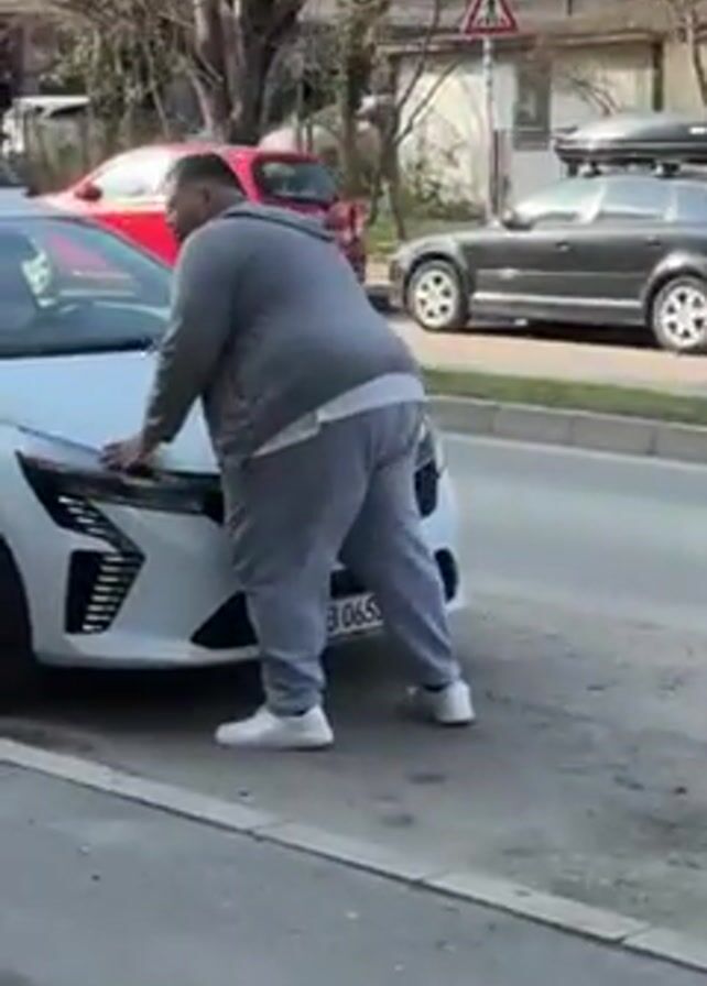 A man is shown in a medium shot leaning his weight into the hood of a white vehicle parked at the side of the road in an urban environment during the daytime. The man is large and wearing a gray sweatsuit and white tennis shoes. The car is a hatchback, with black wheels and a visible license plate with the letters “CB” on it. In the background, a red hatchback, a gray car with a roof carrier, a crosswalk sign, and buildings are visible. The road is gray. The sky is not visible.