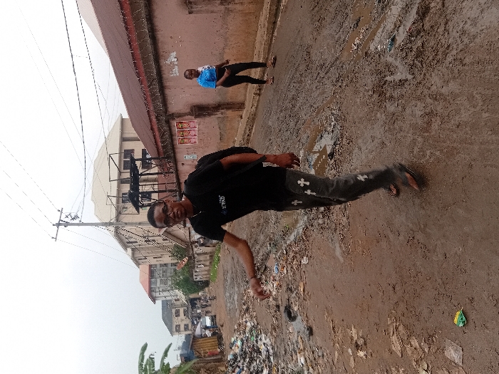 A man with glasses and a black shirt stands sideways on a dirt road. He wears dark jeans with white cross designs. Another person in blue stands further away on the same road. Puddles and trash are visible. The road is flanked by buildings and walls, with power lines overhead. The scene appears to be an urban area, perhaps a less affluent neighborhood due to the trash and muddy conditions.