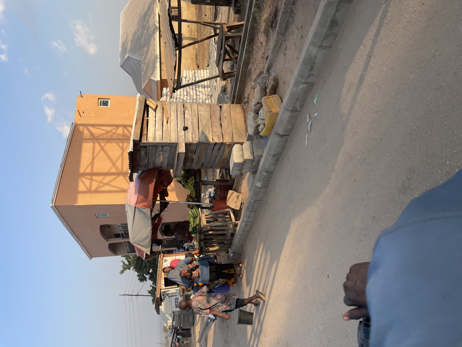 The image depicts an outdoor street scene in Ajaokuta, Nigeria, observed during what appears to be the late afternoon or early evening, indicated by long shadows and warm lighting. The perspective is from a low angle, possibly from a moving vehicle, with a dark-skinned hand in a light blue sleeve gripping a handlebar visible in the lower-left foreground. The scene centers on a paved road that runs horizontally across the frame, bordered on the right by a grey concrete curb. Beyond the curb lies a dirt shoulder. Along this shoulder, multiple structures and individuals are present. On the right, a market stall operates under a red and white/grey striped umbrella, sheltering a wooden display table. This table is laden with various produce, including green vegetables resembling cucumbers or gourds, and bunches of yellow-green fruits, possibly plantains or bananas. A person wearing a light blue top is visible behind this stall, facing towards the left. Adjacent to this, a rustic, two-tiered wooden structure stands. Further right, an open wooden frame structure with a corrugated metal roof, likely an empty stall, occupies a patch of dirt. Piles of grey concrete blocks are stacked on the ground near these stalls, and a yellow plastic container filled with stones is also present. A small group of individuals is gathered near the market stalls on the left. One person, wearing a patterned dress, walks away from the stalls towards the left foreground, carrying a black bucket. Another individual, in dark clothing, is seen carrying a child on their back while standing near the market activity. In the background, a prominent peach-colored two-story building with a flat roof, balconies, and at least one window on the upper floor is visible on the left. A distinct, intricate shadow, possibly from a nearby tower or structure, is cast across its exterior. Further into the background on the right, a single-story building with a light-colored corrugated metal roof is visible. Distant power lines traverse the scene on the far left, and a faint "RCCG" sign is discernible on a small, distant white structure. The sky overhead is clear blue with sparse white clouds.