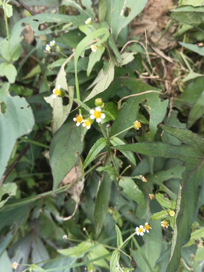 A close-up photograph displays ground-level vegetation in the city of Đăk La, Vietnam. The central subject is a herbaceous plant featuring several small, composite flowers, each exhibiting white ray florets around a central yellow disc of disk florets. These flowers are supported by slender green stems, surrounded by various green leaves. Several leaves exhibit irregular perforations and frayed margins consistent with insect herbivory. A small, dark-colored insect is present on the yellow floral disc of one bloom. The immediate background consists of blurred green foliage and indistinct brown earth, indicative of an uncultivated outdoor setting.