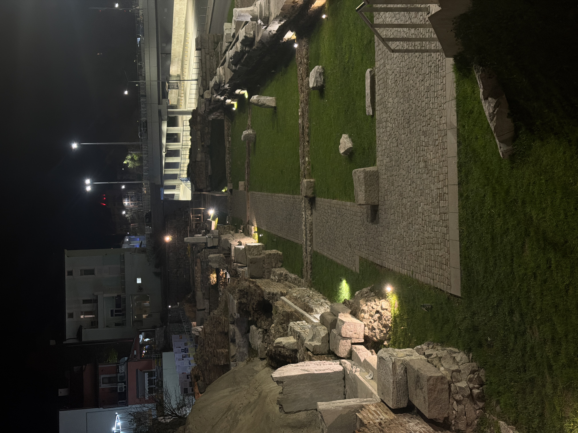 Night scene depicts ancient ruins with stone remnants illuminated by ground lights, alongside a grassy area and a cobblestone path. A modern structure with streetlights is visible in the background. Some residential buildings are seen in the lower left corner, suggesting a blend of historical and contemporary urban landscape.