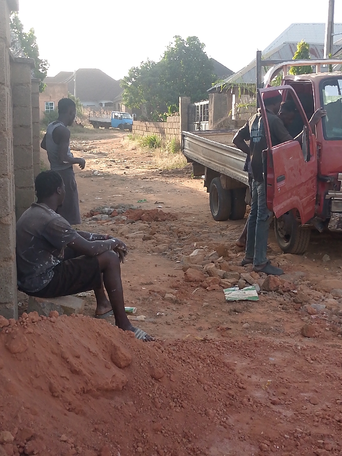 The scene depicts an unpaved, reddish-brown dirt road in Kwang, Nigeria, under bright daylight, suggesting a residential or developing area. In the foreground, a large pile of reddish soil occupies the lower left. To the left, a man is seated on a low concrete block, leaning against a concrete pillar. He wears a dark, possibly paint-splattered t-shirt, dark shorts, and striped slide sandals. His hands are clasped. Standing slightly behind and to his right, another man is visible, wearing a light grey sleeveless top and a dark, skirt-like garment or trousers, looking towards the center of the frame. The dirt road itself is uneven, strewn with scattered rocks, broken concrete, and construction debris, including crumpled green wrappers. On the right side of the road, a red flatbed truck with an open driver's side door is parked. Two men are interacting with the truck: one is partially obscured, leaning into the open door, while the other stands beside the door, wearing a dark shirt and blue jeans, facing the vehicle's interior. In the background, further down the dirt road, a small blue truck is visible. Multiple houses, some with block walls or under construction, and various trees and vegetation line both sides of the road, contributing to a suburban or rural-urban transition zone environment.
