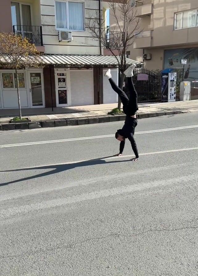 - "A person wearing black pants, a black hoodie, and white shoes does a handstand in the middle of a city street" by FM-RX1d23, licensed under CC BY 4.0