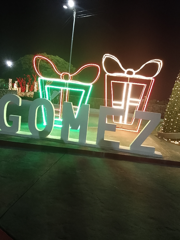 brightly lit outdoor display at night. The word "GOMEZ" is spelled out in large, white letters. Behind the letters are two illuminated, gift box-shaped decorations outlined in neon red and green. A tall light pole stands above the display. A decorated Christmas tree and other illuminated decorations are visible in the background. The ground is a dark pavement surface.