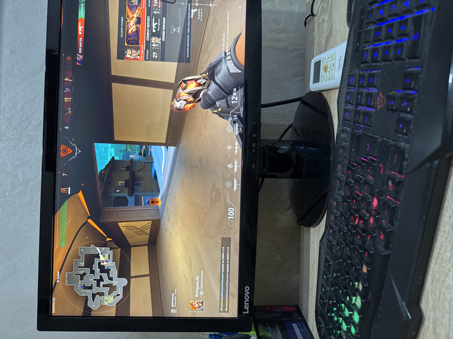 - "A black Lenovo computer monitor is centrally positioned on a light-colored desk surface, displaying gameplay from the video game "Valorant" by FM-Tldlu2, licensed under CC BY 4.0