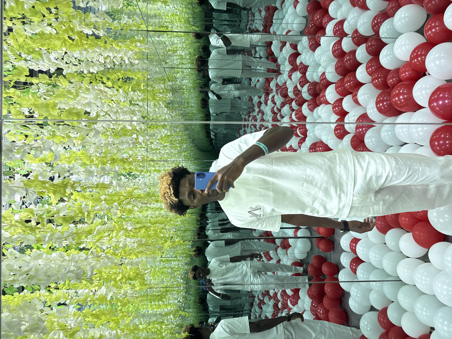 An indoor, immersive art installation in Jakande, Nigeria, features a young Black male taking a mirror selfie