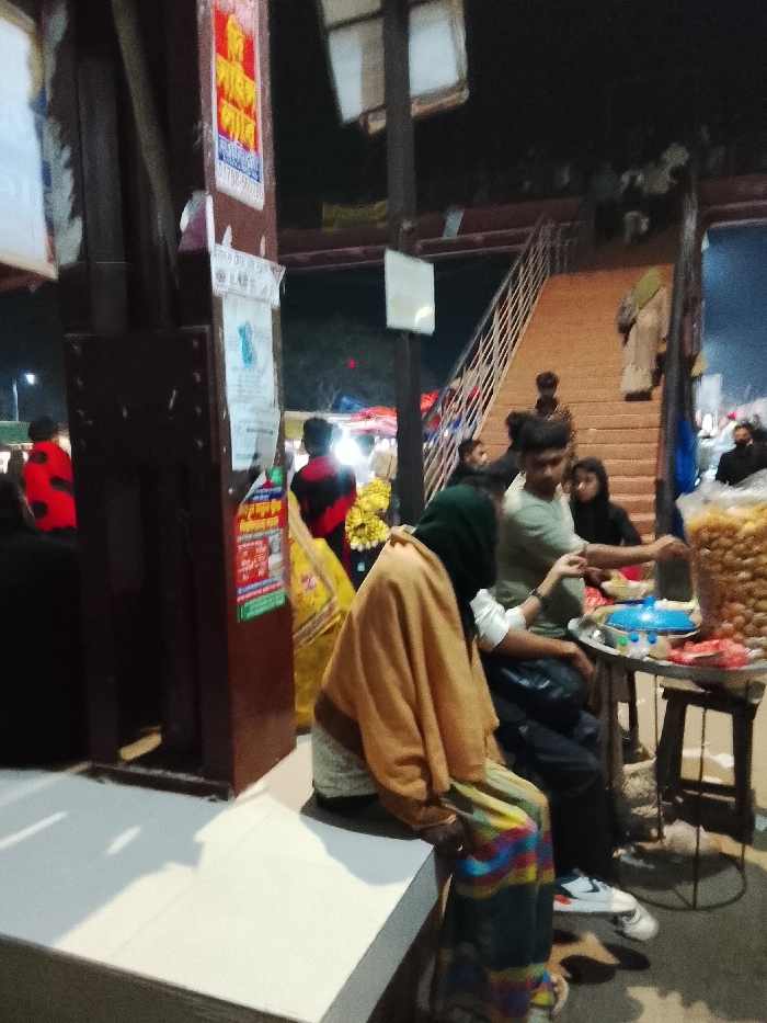 A street scene at night depicts people gathering near what appears to be an elevated walkway or bridge. A person is seated on a white ledge, wearing a patterned garment and an orange head covering. Nearby, a vendor offers snacks from a cart with visible containers. Other individuals are walking around, some ascending the stairs of the walkway. Advertising posters are visible on the structure. The overall impression is that of a busy, possibly festive, outdoor gathering.