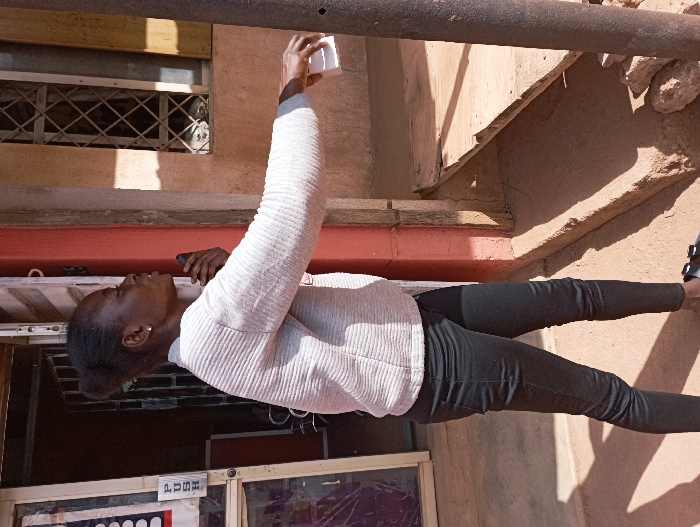 An adult female stands outdoors in profile, facing right, in front of a building in Jos, Nigeria, under direct sunlight