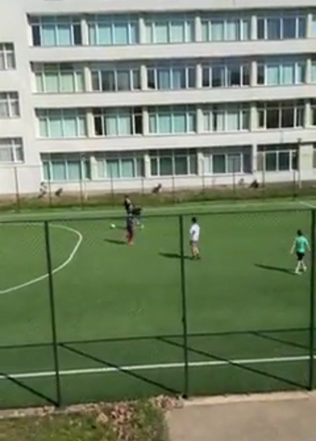 group of people playing soccer on a small, fenced-in field