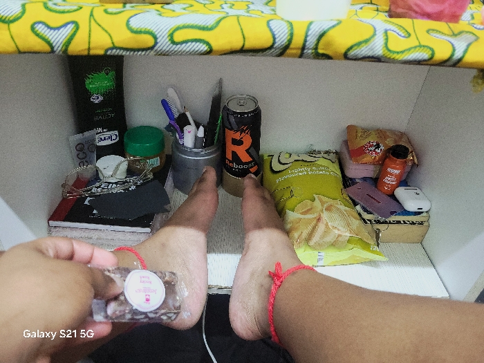 A cluttered shelf contains personal care items, including toothpaste, toothbrushes, and lotion. Food items such as potato chips, a small bottle of hot sauce, and a can of Reboost energy drink are also present. The shelf also holds notebooks, glasses, and headphones. A hand holds a package of what appears to be small brownies or fudge. The image is visually obstructed by the subject's bare feet and legs. A red string is tied around the ankle of the right foot.