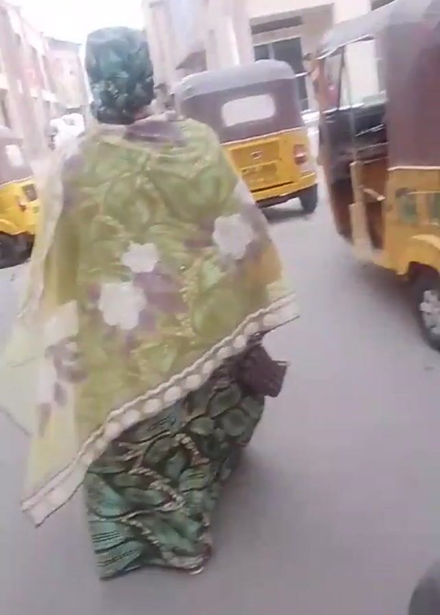 person walking past two yellow auto rickshaws (also known as tuk-tuks) parked on a street. The tuk-tuks have brown roofs and appear to be a common mode of transportation in the area. The person walks from right to left in the frame. A silver car is partially visible on the right side of the screen. A building is in the background. Later the scene pans up to show the building with the text "BLOCK 15" above the windows. One tuk-tuk has cargo secured to the roof. The video is taken at street level.