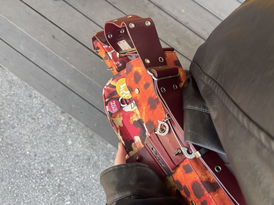 An overhead photograph depicts a person's left hand, wearing a dark leather jacket, holding a multi-textured handbag outdoors in Gnojnice, Bosnia and Herzegovina. The handbag features an orange and red leopard-print fabric with dark maroon leather straps and trim. Multiple silver-toned conical spikes protrude from the top edge of the bag, and a strap is punctuated with silver eyelets. Two circular pins are affixed to the bag's flap: one pink displaying "25% OFF" in white, and another yellow featuring a black "DIOR" logo. A large, ornate silver-toned brooch, encrusted with clear stones, including a stylized "D" charm and a separate pointed spike, is secured to a maroon leather segment of the bag. The visible ground consists of blurred grey granular pavement on the upper left and blurred dark wooden slatted flooring on the upper right.