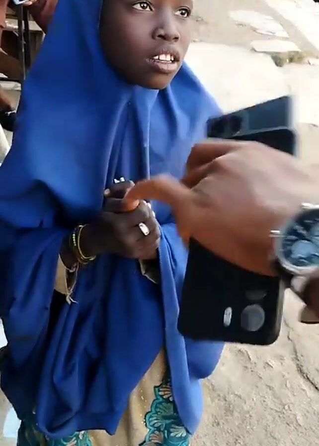 A young girl wearing a blue hijab and colorful clothing stands on a street. She has a headband on and is wearing rings and bracelets. She looks slightly off-camera. A person holding a black phone is partially visible in the foreground. A person is sitting on a chair behind her and a person is standing by a parked motorcycle in the background. The street appears to be outdoors.
