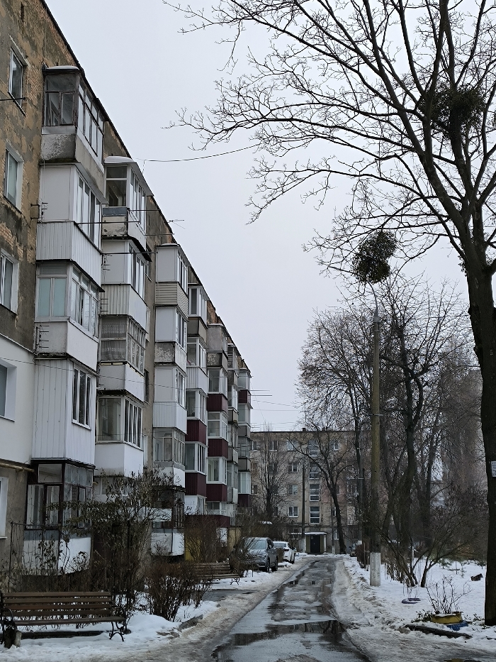 The image depicts a winter street scene in Vinnytsia, Ukraine, under an overcast sky. A multi-story residential building, likely an apartment block, with a beige brick facade and numerous enclosed balconies, occupies the left side of the frame, extending into the background. Many balconies are white, with some further down exhibiting a maroon color. A paved path, partially covered in snow and slush with visible puddles, runs from the foreground into the distance, bordered by snow-covered ground and bare bushes. Two empty wooden benches with dark metal frames are situated on the left side of the path in the foreground. Several parked cars are visible further down the path, near the buildings. On the right, a large deciduous tree with bare branches dominates, featuring two distinct clusters of mistletoe. Several other bare trees and a utility pole are present further down the right side. In the background, another multi-story residential building with a lighter facade is visible through the bare trees. No people are present.