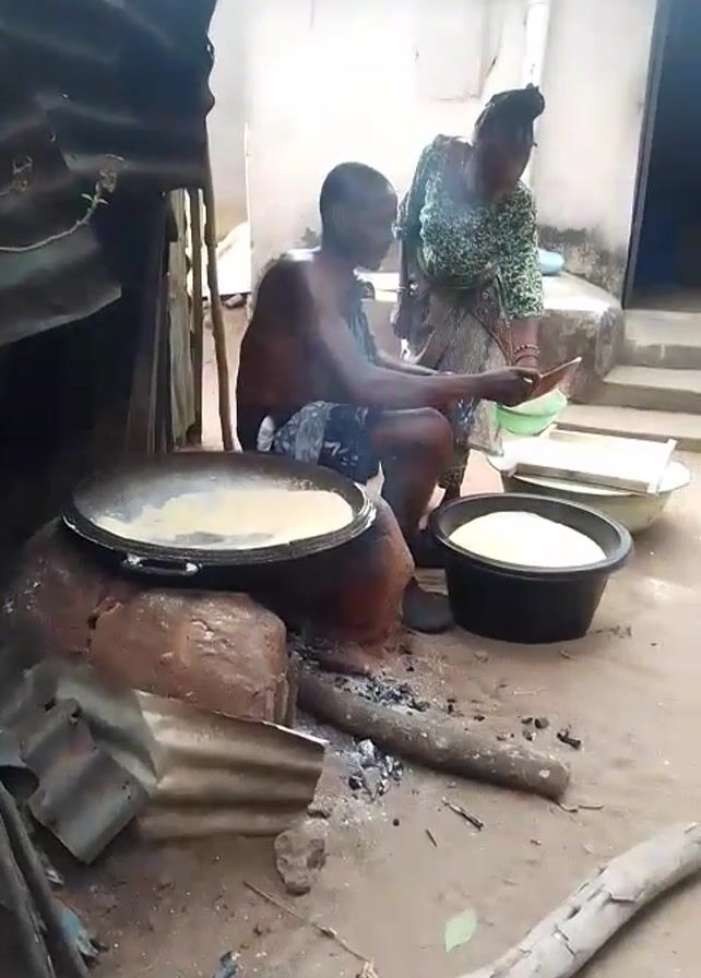 A man sits shirtless on a stool outdoors, stirring a large pan over a fire fueled by wood and charcoal. Beside him, a woman holds a green bowl, appearing to assist in the cooking process. They're in a somewhat rustic setting with corrugated metal nearby, suggesting a simple outdoor kitchen arrangement. Another container holding a white substance sits nearby. There are stairs going up to a house behind the woman.