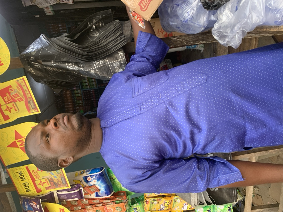 A man in a blue patterned shirt stands in a small shop. He is surrounded by various products. Maggi seasoning packets are prominent, with yellow and red designs. Black plastic bags are stacked nearby. Other items, including laundry detergent and assorted packaged foods, are visible on shelves. The scene suggests a neighborhood convenience store or market. A wooden shelf is also visible.