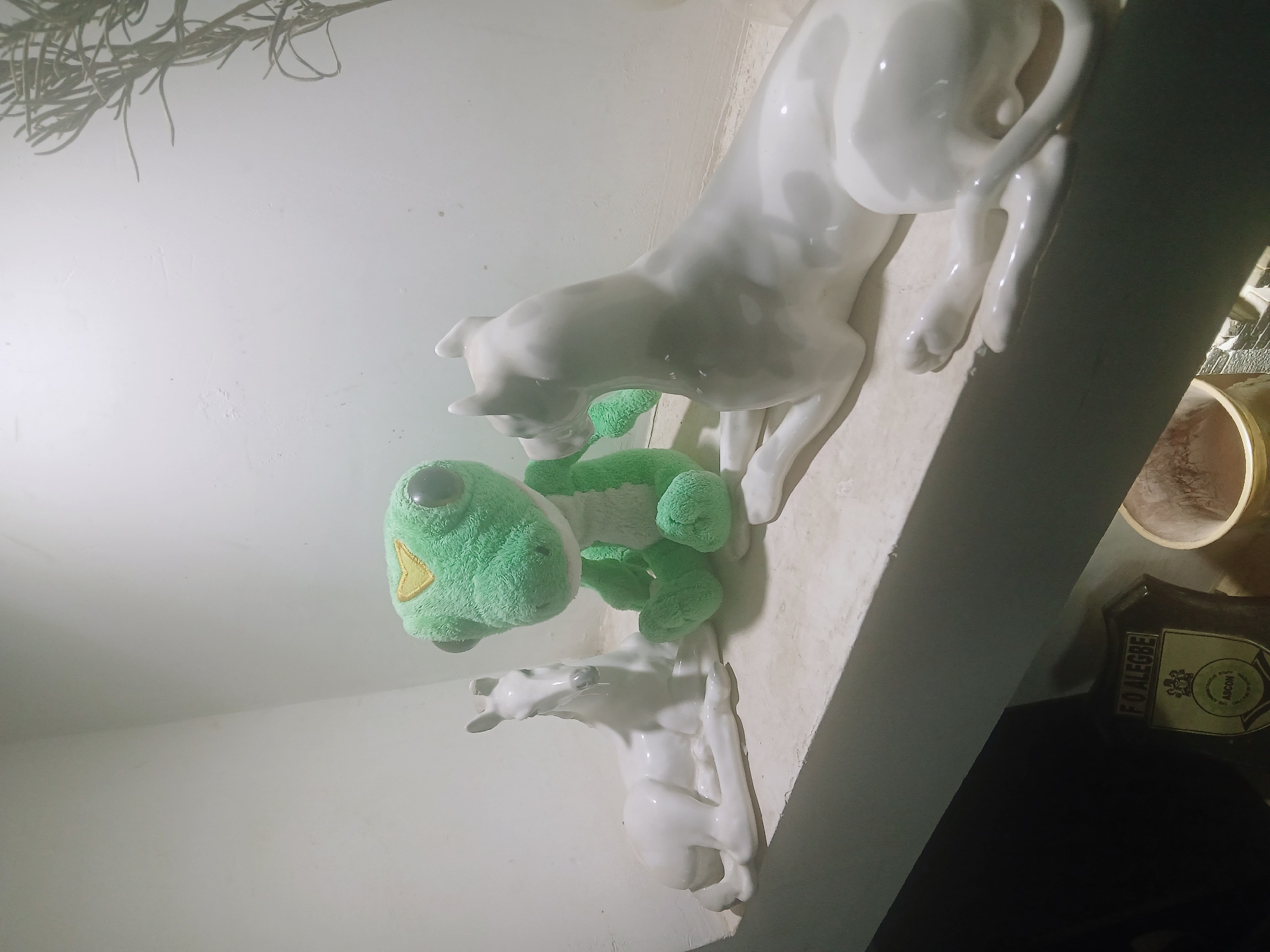 A high-angle shot depicts a shelf or ledge against a white wall. On the shelf are three objects: a white ceramic panther figurine is positioned above a green frog plush toy, which is adjacent to a white ceramic horse figurine. To the right, off the edge of the shelf, a jar and an item labeled "FO ALEGBE" are visible. The setting appears to be indoors. There is no evidence indicating this location is in Kitwe, Zambia. No people are visible.
