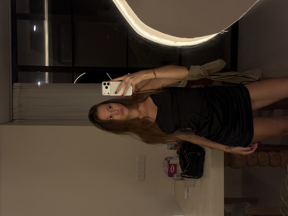 A young adult female is depicted in a mirror selfie within what appears to be an indoor accommodation, likely a hotel room, in a city in Unknown, Indonesia. She has long, light brown hair, appears to be standing, and is wearing a black satin mini-dress with thin straps and ruching on the sides. Her left hand holds a light-colored smartphone, possibly an iPhone, angled towards the mirror to capture her reflection. A silver-colored ring is visible on her left ring finger, and a red bracelet is on her right wrist. Her gaze is directed slightly off-camera to her left. The room features a light-colored wall with three white power outlets or switches mounted horizontally. To her left, a light-colored, possibly stone or concrete, rectangular table is visible, cluttered with various items including a white tissue box with pink accents, two metallic beverage cans (one with a star logo, possibly Bintang beer), a clear glass with a liquid and ice, and a black leather-like bag with buckles. Behind the subject, a large window or glass door with a dark frame reveals an outdoor, nighttime scene. A beige curtain is partially drawn on the left side of the window. Beyond the glass, faint, modern architectural lighting, including a linear light strip and a curved luminous element, suggests a contemporary building or outdoor area. A large, illuminated, curved mirror or decorative light fixture is partially visible on the far right, reflecting parts of the room and an additional light source. The interior lighting is warm and indirect, illuminating the subject and the immediate foreground.