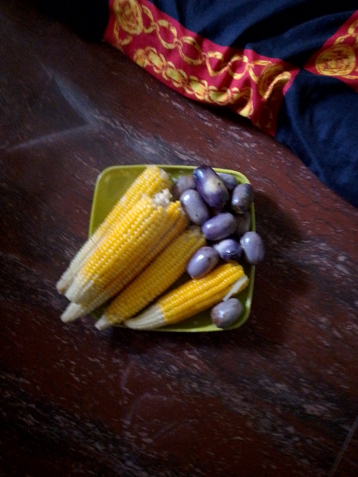 An overhead shot displays a lime green rectangular plate positioned on a dark brown wooden surface. The plate contains four partially shucked ears of yellow corn with bright yellow kernels and pale husks at their base. Adjacent to the corn is a pile of approximately fifteen to twenty cooked, oblong, purple-grey legumes or nuts. In the upper right background, a dark blue or black fabric with a repeating pattern of red and gold chain-link motifs is visible. No individuals, actions, or interactions are depicted. The precise location in the city of Unknown, Unknown is indeterminable from the image.