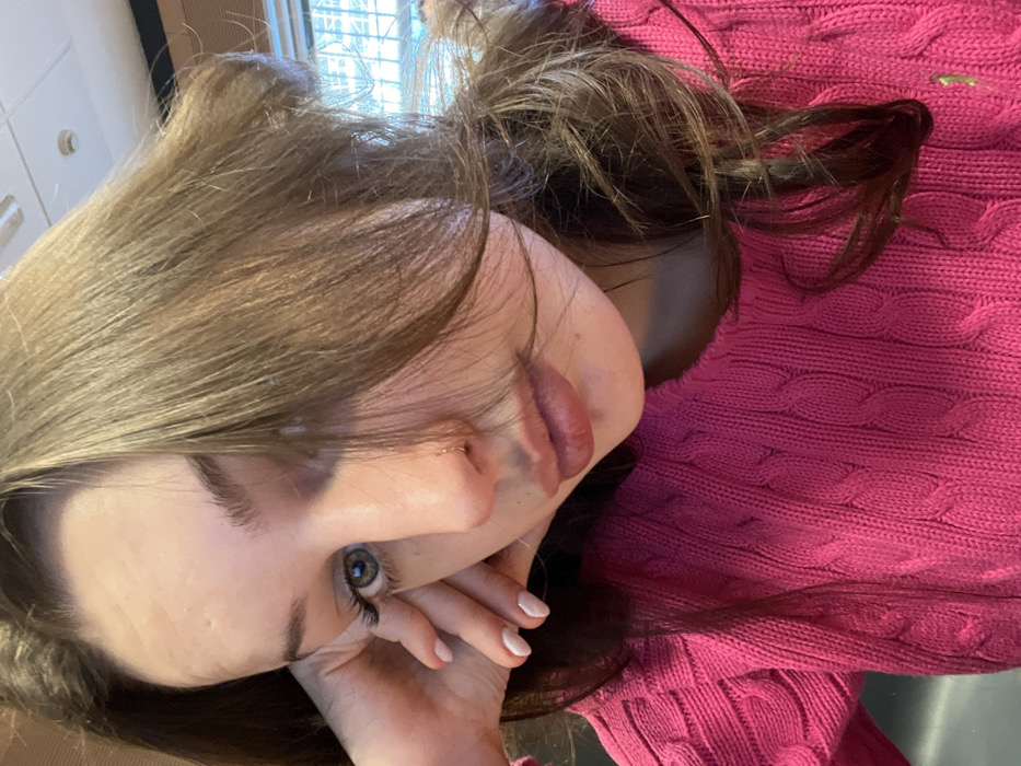 A young adult female is shown in a close-up, slightly tilted portrait, directly facing the camera. She has long, dark brown hair, with strands partially covering the left side of her face (viewer's right). Her blue-green eyes are open and directed forward. A small, gold-colored hoop piercing is present on her right nostril. Her lips are lightly parted, exhibiting a natural, subdued pinkish-brown tone. Her left hand, with manicured nails painted a light pink or nude color, is positioned against her jawline and cheek, supporting her head. She is wearing a fuchsia-colored, cable-knit sweater. The background is an indistinct, out-of-focus indoor environment. Visible elements in the blurry background include a window with a horizontal grid pattern in the upper right, and a light-colored ceiling where a circular, white fixture, consistent with a smoke detector or recessed light, is partially visible. The scene is illuminated by ambient indoor lighting, supplemented by natural light from the window. The precise location in the city of Milan, Italy, cannot be determined from the visual evidence within the image.