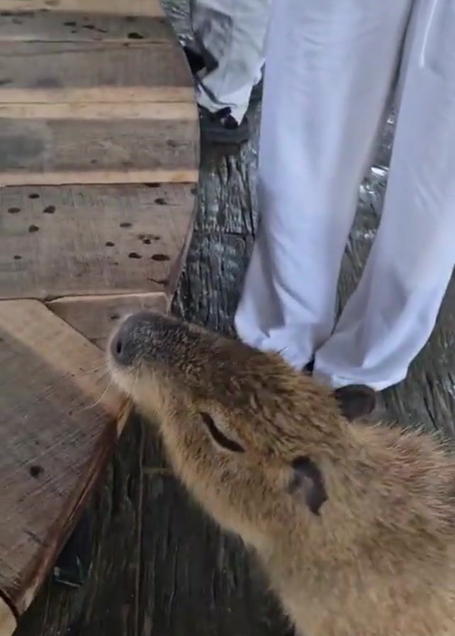 A close-up shot shows a capybara gnawing on the edge of a wooden platform. The capybara has light brown fur and small ears. It is standing on a wet, dark-colored wooden surface. The capybara's head is tilted upwards as it bites into the wood. Behind the capybara's head and body, a person wearing white pants and black sandals is visible. The wooden platform appears to be part of an outdoor structure.