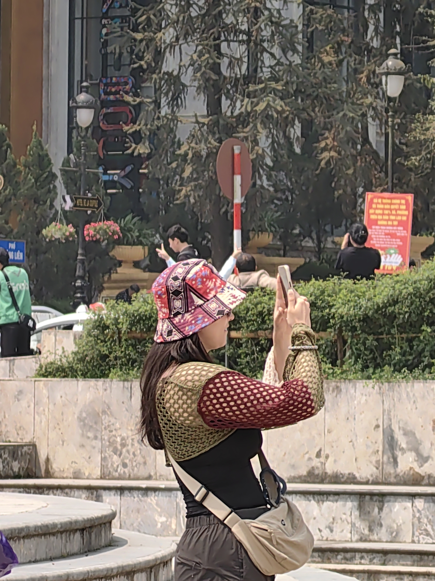 The image captures an outdoor urban scene in Sa Pa, Vietnam, during daylight. In the foreground, a female subject stands on a light-colored, multi-tiered stone step structure, facing right and actively holding a beige smartphone vertically with both hands, pointed forward as if photographing or recording. She wears a multi-colored bucket hat with geometric patterns, a black top, an olive green open-knit shrug over a maroon patterned long-sleeved layer, dark cargo-style pants, and a beige cross-body bag with a wide strap. Behind her, in the mid-ground, a low green hedge separates the foreground from other subjects and structures. To the left, a partially visible individual in a green jacket and black pants stands near a white vehicle. Above this person, a blue sign with white Vietnamese text "CÔNG VIÊN LÊN" is mounted. Centrally, a male subject in a black shirt is visible from the back, also appearing to hold a device. To the right, a red and white striped pole is positioned next to a rectangular red sign displaying white Vietnamese text. Dense evergreen trees and bushes occupy much of the background, partially obscuring a building facade. A decorative vertical sign spelling "ROCK" in colorful letters is affixed to the building, visible through the foliage. An ornate street lamp and hanging baskets with pink flowers are also present.