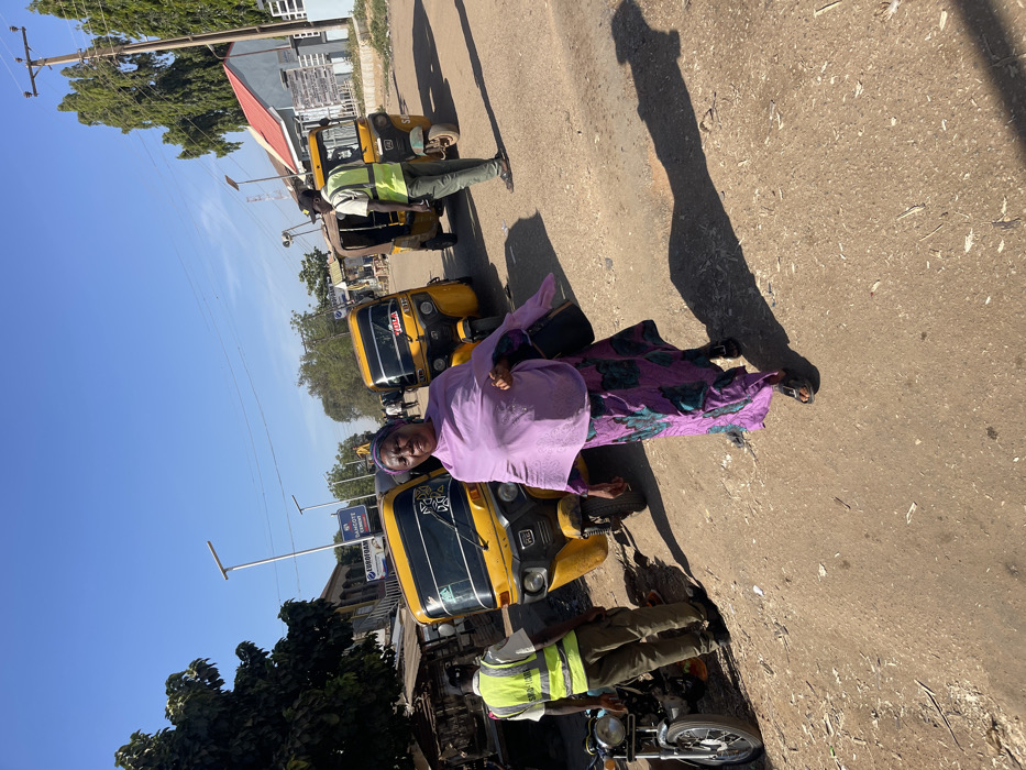 The image depicts a daytime street scene in Chikaji, Nigeria, under a clear blue sky. In the foreground, a woman of apparent middle age walks right, her body angled slightly away from the camera. She wears a long, patterned purple and teal dress, a light purple headscarf draped over her head and shoulders, and dark open-toed sandals. She carries a dark handbag over her left shoulder, and her mouth is slightly open. Behind the woman, a dusty, unpaved road occupies the lower half of the frame. To the left, a man in a green high-visibility vest and khaki pants stands beside a silver motorcycle, partially obscuring a yellow three-wheeled autorickshaw (Keke Napep). Another yellow Keke Napep is centrally located, displaying "TULA" on its side. Further to the right, a third yellow Keke Napep, marked "SULE," is parked, with a second man in a green high-visibility vest, khaki pants, and dark flip-flops standing next to it, facing the vehicle. In the background, buildings line the street. Visible signs include "EUROFOAM" and "DANGOTE CEMENT." Tall trees are present on both sides of the road, and modern streetlights with solar panels are installed. Utility poles with power lines are also visible on the right. Long shadows are cast on the ground, indicating strong sunlight.