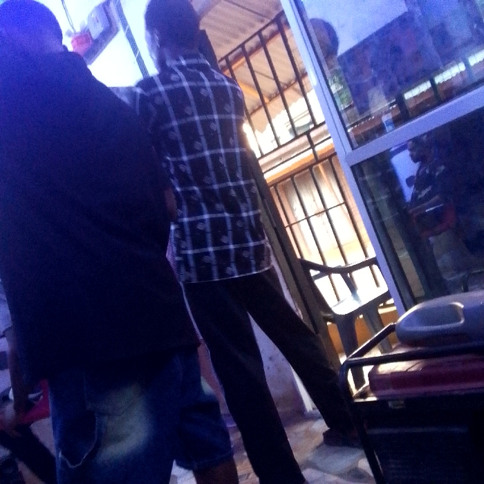The image displays an outdoor or semi-outdoor commercial scene in Onitsha, Nigeria, rendered with a predominant blue ambient light. In the foreground, two individuals stand with their backs to the camera. The leftmost figure wears a dark short-sleeved top and faded blue denim shorts. To their right, a second individual wears a dark plaid long-sleeved shirt with white patterning and dark trousers. To the right of these figures, a glass door or window reflects an interior, showing a blurry human figure, possibly holding a tablet, and indistinct wall-mounted items that resemble posters. In the immediate right foreground, the upper section of a portable generator is visible, featuring a light grey housing with a handle and a red-maroon body. The background, visible through an open doorway or window, reveals dark metal security bars, a dark plastic chair, and part of a corrugated metal roof structure.