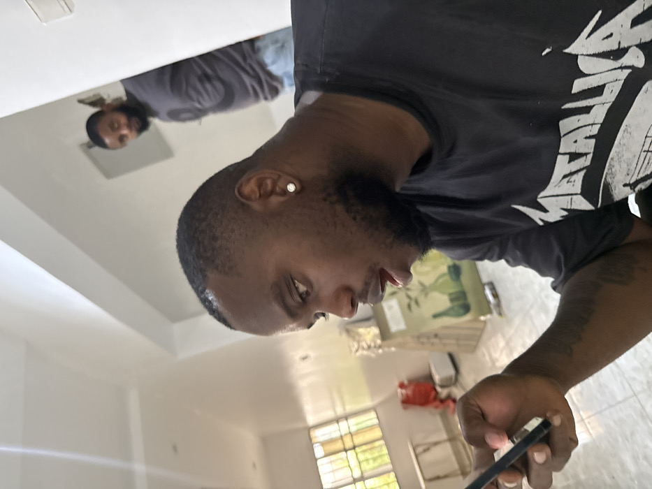 The image depicts an indoor scene in Iddo Tudunwada, Nigeria, featuring two Black males within a brightly lit room. In the foreground, a male with short dark hair and a short beard wears a black t-shirt with a white "METALLICA" graphic. He has a round, clear stud earring in his left ear. He holds a black smartphone in his left hand, looking down at its screen with his mouth slightly agape, indicating focus or surprise. A tattoo is visible on his left forearm. In the background, partially obscured by a white doorframe, another male with dark hair and a beard is visible. He wears a grey long-sleeved shirt and blue jeans, looking directly towards the foreground. The room has white walls and a white ceiling. A large window with multiple panes on the left side of the frame allows natural light into the space, with green foliage visible outside. The floor appears to be tiled in a light color. Various objects are scattered in the background: a light-colored table, a red object (possibly a bag or container), a small white appliance (possibly a toaster or mini-oven), and a framed piece of artwork depicting green bottles or vases. The interaction suggests the foreground subject is occupied with his device, while the background subject observes him.