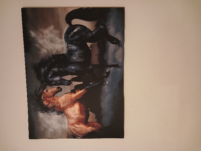 A portrait depicts two horses intertwined against a moody backdrop of grays, browns, and blues