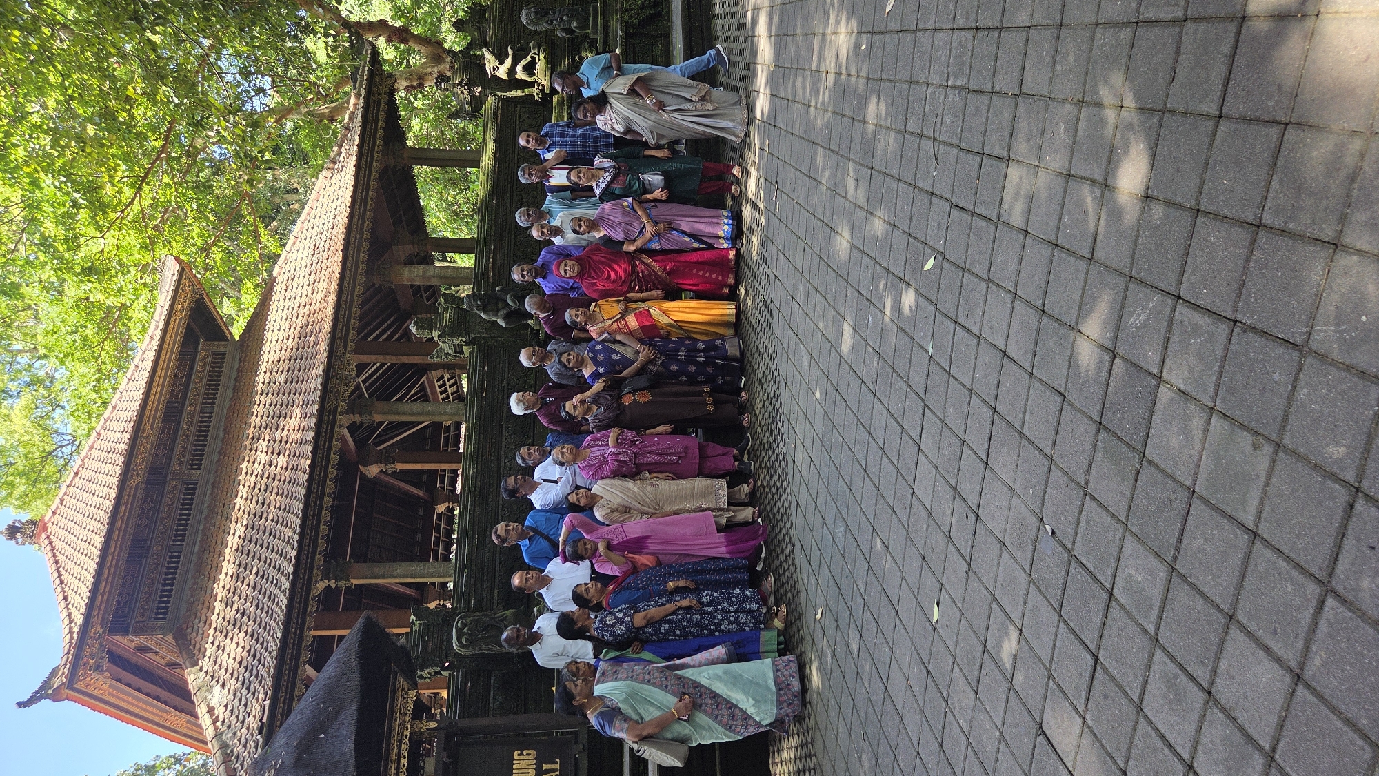 A group of approximately 30 people poses for a group photo on a paved pathway next to a traditional Balinese building in Ubud, Indonesia. The people are of various ages and are dressed in a variety of clothing, including traditional Indian attire. The building is ornate and features a multi-tiered roof, intricate carvings, and stone statues. The pathway is made of gray paving stones. Trees and vegetation surround the building. The sky is clear and blue.