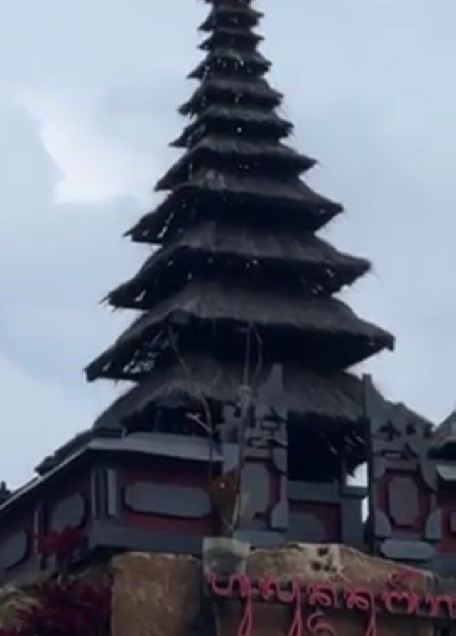 Balinese landmark, the Ulun Danu Beratan Temple in Bedugul, Bali. The camera zooms out from a close-up of the temple structure atop a rock formation adorned with red and white flowers. The structure itself is decorated with red accents and topped with a tiered, dark thatched roof. The sign reads "Ulun Danu Beratan Bedugul - Bali" in red letters. As the camera pulls back, the entire structure is revealed, built into a rock archway with the temple visible in the background. People are seen walking around and through the archway. The weather appears overcast, with a cloudy sky visible.